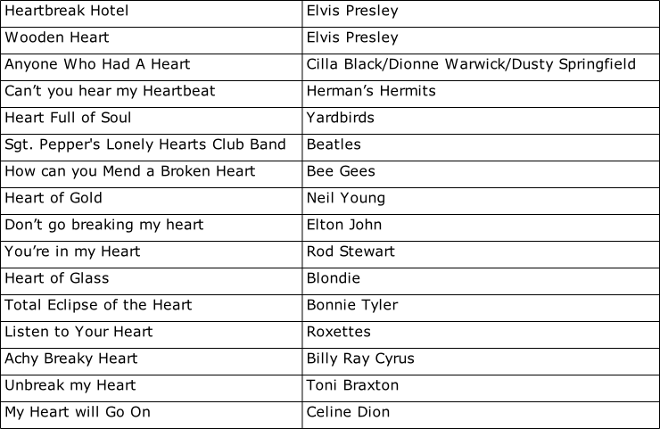 “Songs with “heart” in the title”