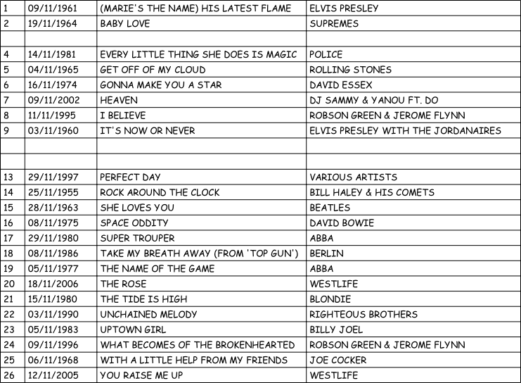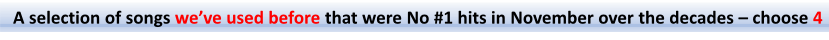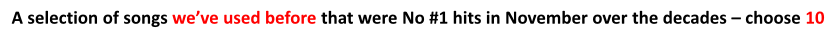 Song List showing the selections for the November 19, 2025 “November Hits” session from which a selection will be made by our participants