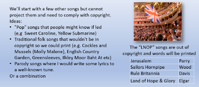 Each session will include the 4 “Last Night of the Proms” songs preceded by 2 or 3 songs typical of a SfF session.