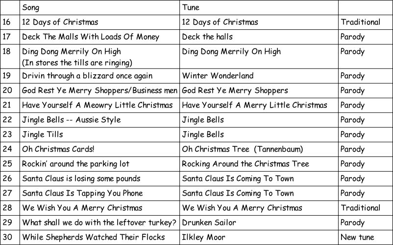 Song List showing the selections for the December 17, 2025 “November Hits” session from which a selection will be made by our participants